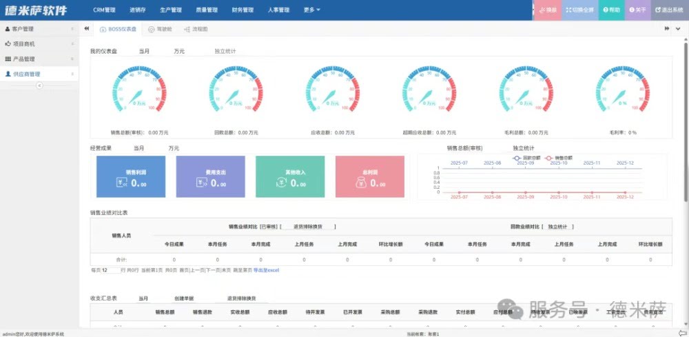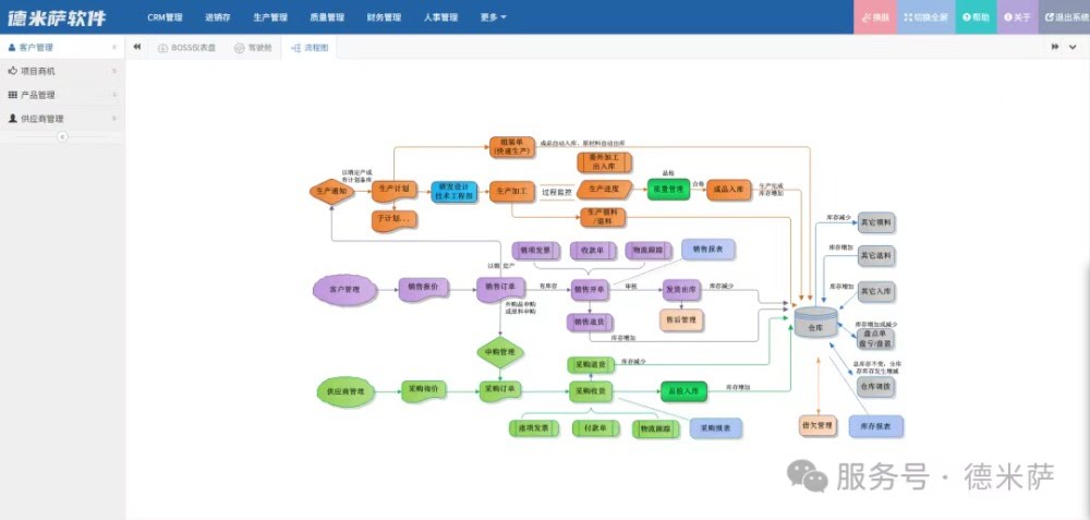 多数采用基于J2EE的多层B/S架构,支持跨平台运行和远程访问。 例如,德米萨ERP系统以前端AJAX技术提升交互体验,后端以模块化、组件化设计支持按需定制和功能扩展,从而适应企业快速变化的业务需求。 2.深度集成,全流程覆盖 优秀的管理软件能够覆盖从客户关系、销售、采购、生产、仓储到财务、售后等全业务链,实现各环节数据自动关联、状态实时更新。 例如,销售订单可自动驱动生产计划与采购需求,财务数据与业务单据实时同步,确保账实相符。 3.权限精细,安全可控 通过角色、数据范围、审批流等多层权限控制,确保数据安全与操作合规。同时,支持电子附件、数字签名等多重手段,保障业务痕迹完整可追溯。 4.智能分析,辅助决策 内置多维度统计报表与数据分析工具,如销售漏斗图、库存预警表、生产进度跟踪、利润明细统计等,帮助管理者从海量数据中洞察业务本质。 PART.03 案例分析:一体化管理的实践体现