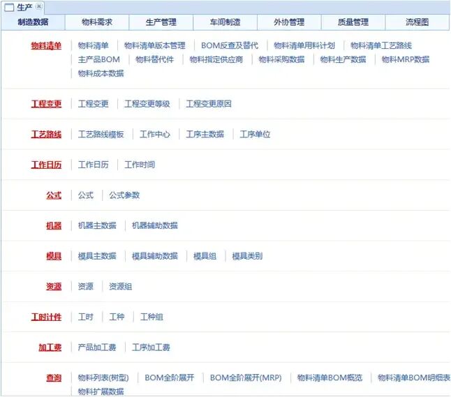 制造数据包括物料清单BOM、工艺路线、物料扩展信息、工作中心、工序、机器、模具、工种、工厂日历及其它与计划、生产、成本分摊有关的基础信息。制造数据是编制生产、采购、外协、配套领料、工序调度、工序投入产出、跟踪物流及生产过程、计算成本、改进产品设计等都需要参照的重要文件。