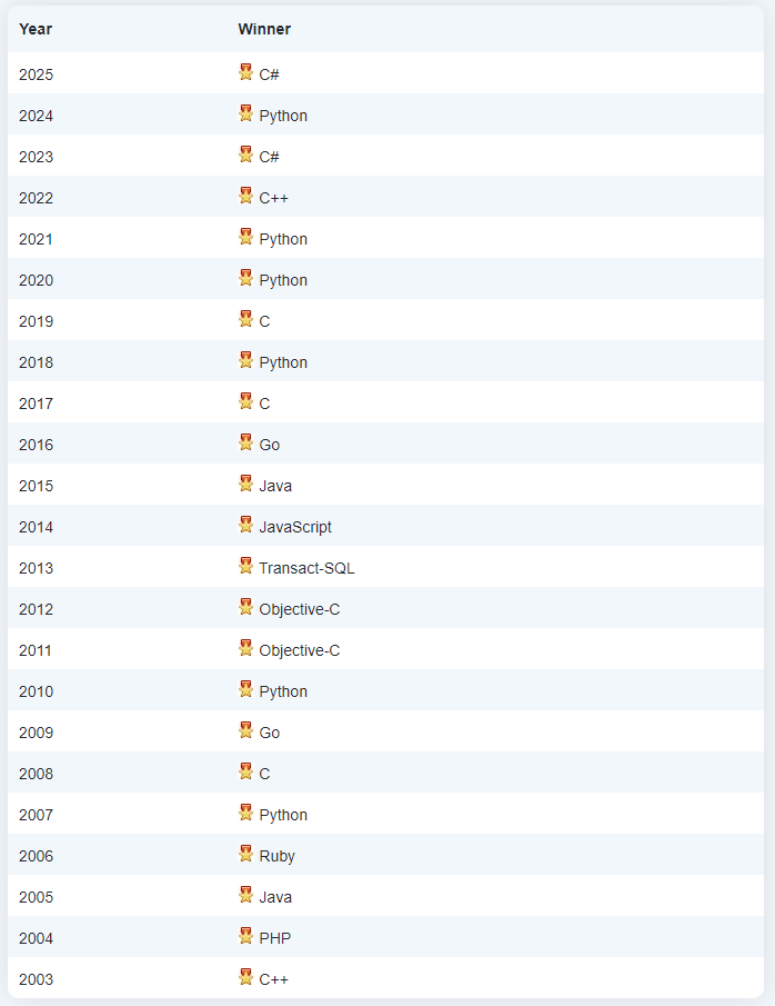 C# 获评 TIOBE 2025 年度编程语言,Python 稳居榜首