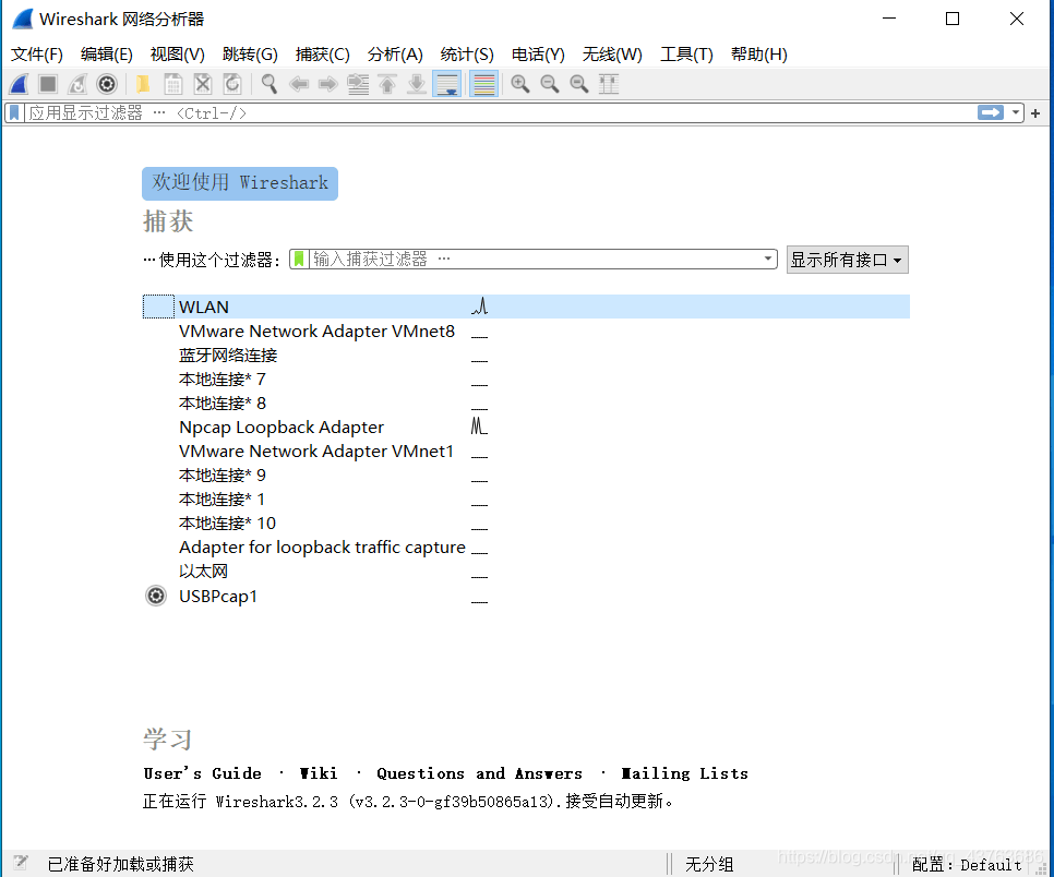 打开 Wireshark:由于笔记本连接的是 WIFI,因此点击 WLAN。