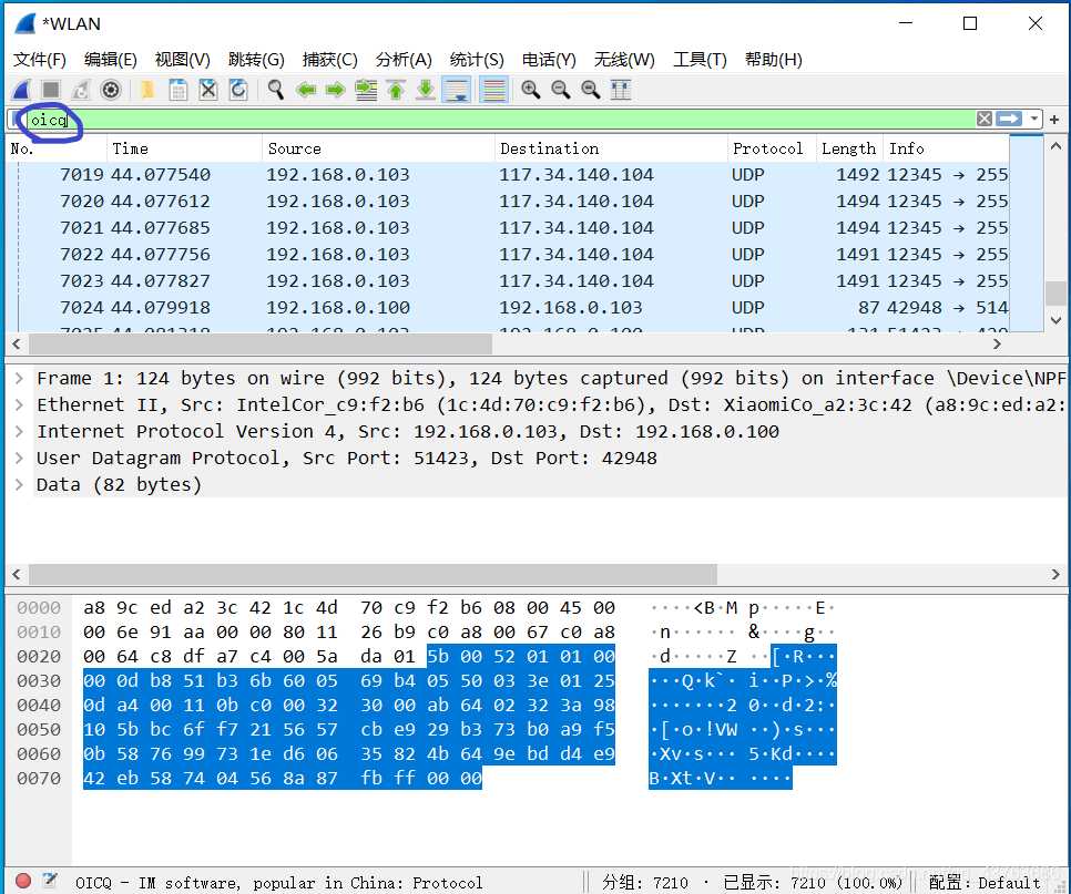 停止抓包:点击左上角的正方形角标,停止抓包。在应用显示过滤器中输入 oicq,然后按下 Enter,即可显示 QQ 数据包。
