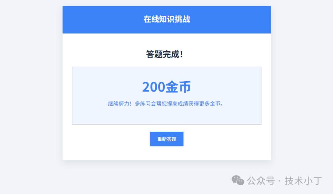 <div class="result-screen hidden" id="resultScreen"> <h2>答题完成!</h2> <div class="score-display"> <div class="score-number" id="finalScore">0金币</div> <div class="result-message" id="resultMessage"></div> </div> <button class="btn" onclick="restartQuiz()">重新答题</button></div>