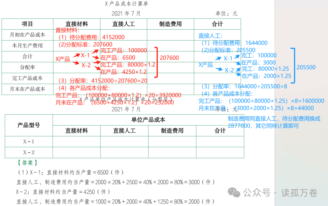 2、其他费用(直接人工、制造费用):按约当产量法分配。这隐含了“加工成本(工、费)随生产进度均匀发生”的假设,因为需要计算在产品的完工程度(例题给出了各工序的完工程度)。