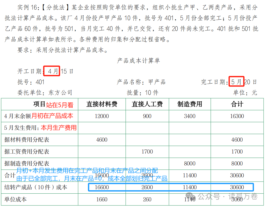 处理:分批法标准应用。该批次5月全部完工后,将其成本计算单上归集的全部生产费用(4月末余额+5月发生费用)合计30,600元,直接全部结转为10件产成品的总成本,并计算单位成本。