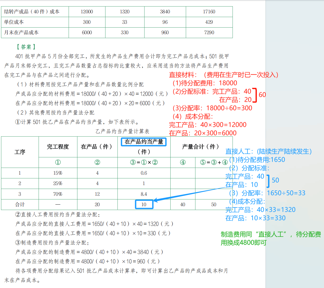 1、材料费用:按完工产品和在产品的数量比例(40:20)分配。这隐含了“原材料在生产开始时一次投入”的假设,因为分配基础是实物数量,而非约当产量。
