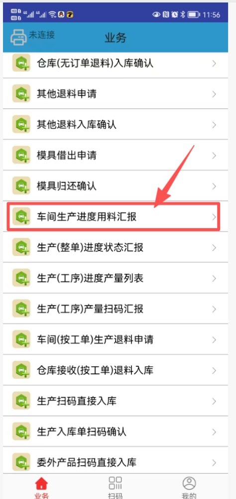 打开手机业务通APP,进入菜单-车间生产用料汇报,如下图所示: