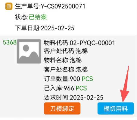 查询到单据,点击‘模切用料’按钮