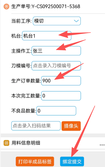 进入界面后录入对应的操作人,数量,机台,模具等信息,点击绑定提交后完成