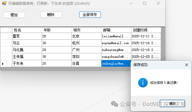private void BtnAdd_Click(object sender, EventArgs e) { people.Add(new Person { Name = "新用户", Age = 30, City = "上海", Email = "new@email.com", CreateDate = DateTime.Now });