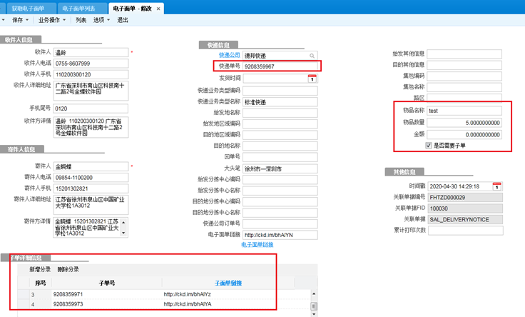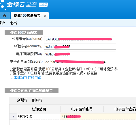 实时查询customer,客户授权Key,分别填到金蝶云快递100参数的公司编号和授权秘钥中获取快递单号,有两种方式:1、申请电子面单后自动回填快递单号;2、导入快递管家后打印快递单时自动回填快递单号。除了维护授权信息外,还需将上面的客户授权Key,电子面单secret,分别填到电子面单授权key和电子面单密钥(secret)中,并且维护快递公司电子面单参数配置中的电子面单(月结)账号密码等信息,电子面单(月结)账号密码需用户单独向合作的快递公司索取。然后打开获取电子面单,在明细中点击单据编号,选择返回数据,然后点击申请电子面单即可进行申请3.2申请成功后打开列表可以看到快递单号回填到单据上了,并且多了一个电子面单链接。3.4通过申请电子面单获取物流单号到单据上后,通过物流查询跳转到销售物流信息列表。此外手工维护好物流公司和物流单号,也是可以刷新物流信息回来的。3.5销售物流信息列表,点击刷新物流信息,即可将物流信息更新回金蝶云系统中。3.6支持子母单返回,在获取电子面单中,维护物品数量,并勾选是否需要子单,然后点击申请电子面单。即可返回子单,例如录5则返回母单1个,子单4个3.7支持签回单,在获取电子面单中勾选“是否需要签回单”即可