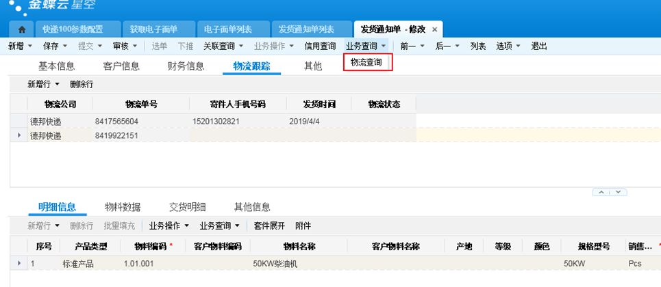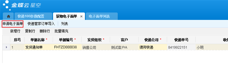 - 导入快递管家,批量打印电子面单,自动回填快递单号到单据上,实时更新物流信息到金蝶云。