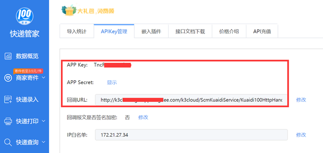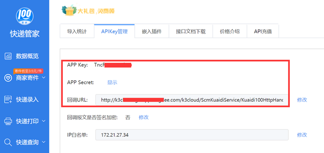 除上面获取物流信息的方式外,推荐使用快递管家的推送服务,可以实现自动实时更新物流信息。文档后面的快递管家充值中有介绍。2.c、点击开发者接口申请-立即申请置,填写资料查看API key即可。2.d、然后将上面的APP key和APP Secret填回金蝶云快递管家参数配置中。除了在金蝶云中快递100参数配置快递管家的API Key外,还需要设置回调url,位置:快递管家-更多-API服务-AppKey管理-回调url共两种服务,订单导入和订单导入推送服务。推荐购买订单导入推送服务,因为它不仅包含了导入服务的功能,另外即使没有申请授权信息,在快递管家打印快递单后,如物流信息发生变化,能实现自动实时更新物流信息到金蝶云销售物流信息列表和单据的物流跟踪页签上。而不用去勾选“定时更新销售物流信息并进行时间范围控制”参数。即比原来的定时更新服务,能更及时地更新的快递物流状态。4.a、除了快递管家key和secret设置外,下面的默认寄件信息也需设置。4.b在获取电子面单中选择要导入至快递管家的订单信息点击“快递管家订单导入”按钮即可完成订单导入功能。收件人信息来源单据上的收货方信息,寄件人信息来源快递100参数中设置的默认寄件人信息。4.d导入成功后,点击列表,即可以看到电子面单列表中多一条记录。并且登录快递管家的待打印页签也多一条记录,点击打印快递单打印完后会回填快递单号到电子面单列表和单据物流跟踪页签上。