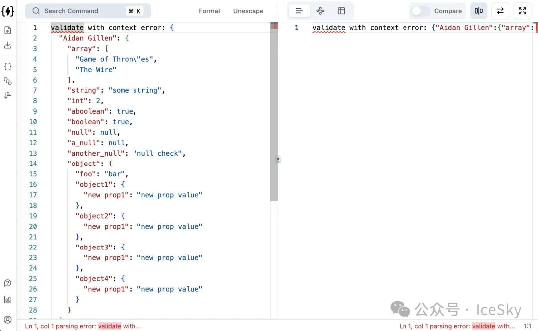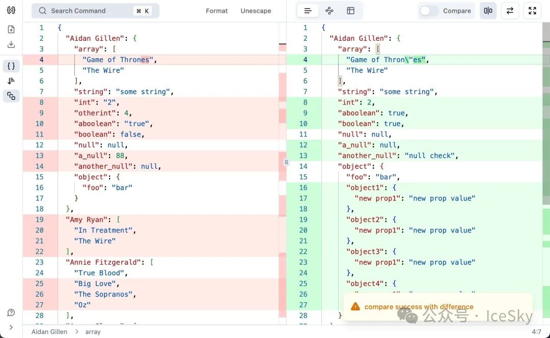 比较:支持结构化差异对比和纯文本对比,方便快速发现两个JSON文件的异同。