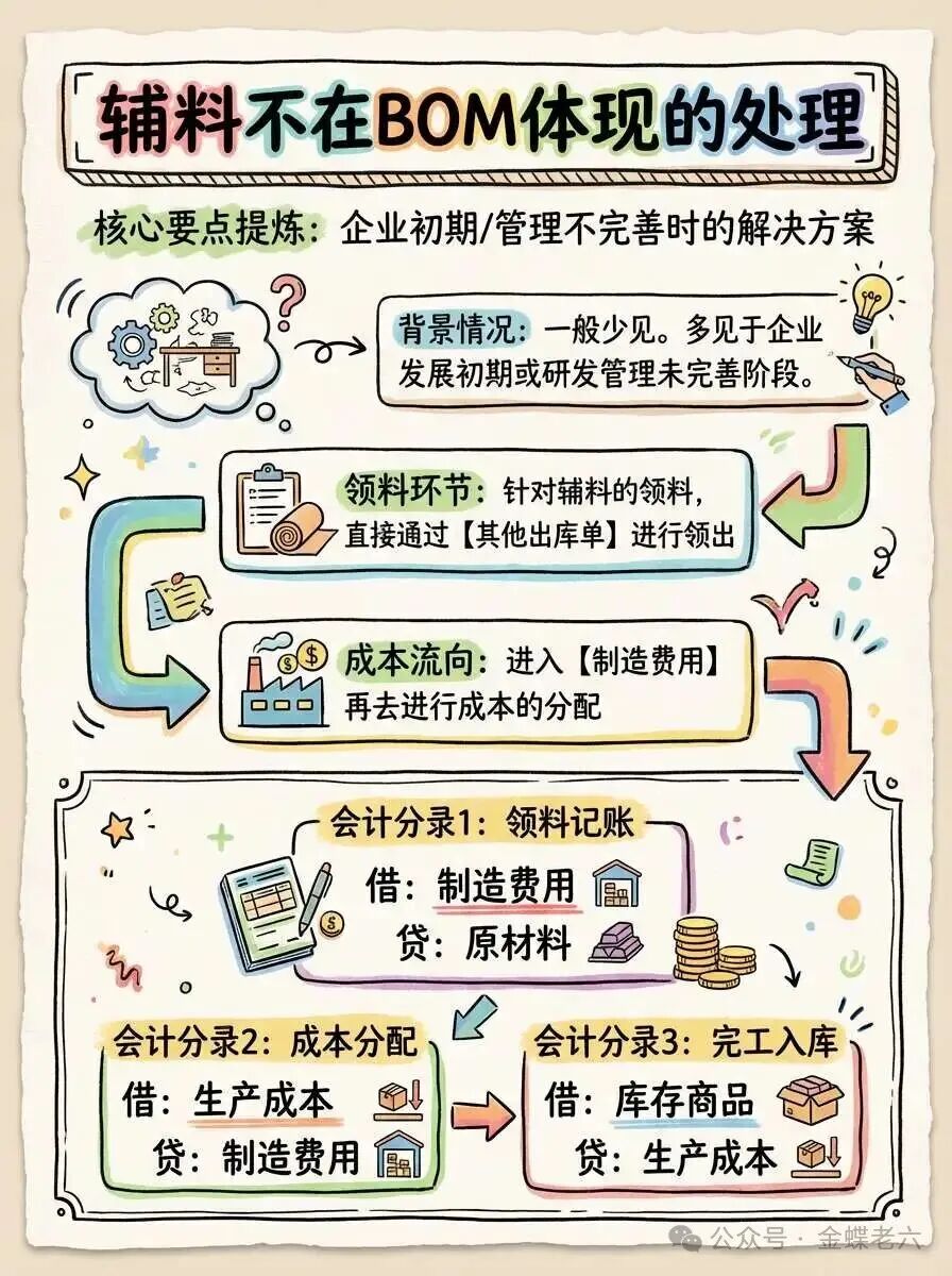![]() 大家好,我是涂鹏飞,一名金蝶ERP高级实施顾问,精通企业信息化全流程全业务建设! 今天我们来聊一个几乎所有项目都会碰到的生产发料管理问题,就是针对低值易耗品的生产辅料管理(比如包材、螺丝、海绵、扎带等等),如何进行领料、发料、BOM维护等等。 低值易耗品的生产辅料,是指在企业生产过程中,为保障产品制造、设备运行或生产环境维护而消耗的,单位价值较低、使用周期较短、不构成产品主要实体的辅助性物料。这类物料通常在生产中重复使用,但易损耗、需频繁补充,属于流动资产范畴。 文章中所指的这部分物料有以下几个特征,低价值、数量难管理、通用等。 一:如果这部分物料压根不在BOM体现如果辅料「文章就使用这个名称」不在BOM体现,这种情况一般比较少,一般处于企业发展初期,或者研发管理还没有完善的情况会有。 针对这类情况,针对辅料的领料直接通过其他出库单进行领出,然后进入制造费用再去进行成本的分配即可。 借:制造费用 借:生产成本 借:库存商品