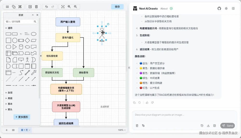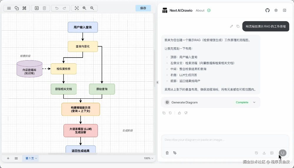 这个项目支持在线体验,你可以完全从 0 开始画图,比如画一个流程图,演示 RAG 的工作原理。 ⭐️ 建议观看视频演示:bilibili.com/video/BV18N… AI 会自动生成 Draw.io 绘图代码,很快精美的流程图就搞定了!
