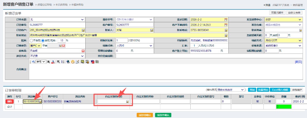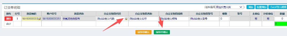 进入界面后,选择客户,选择内部料号,再点击选择自定义物料,填写好对应数量与单价提交完成,如下图所示: