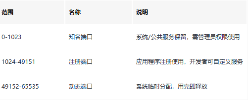 端口取值范围0-65535,共65536个,按用途分为三类: