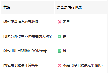 现代JavaScript引擎的垃圾回收机制越来越智能,只要合理使用,闭包不会成为内存泄漏的主要原因。
