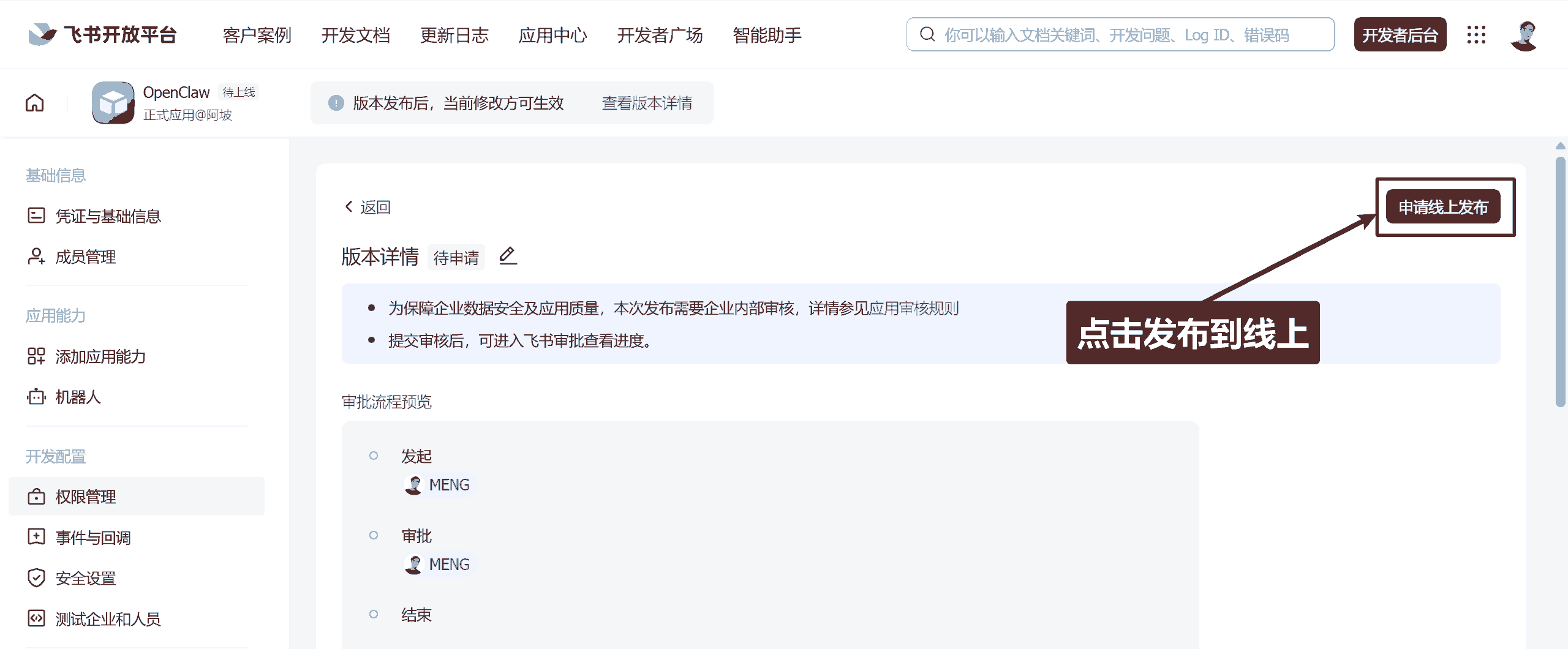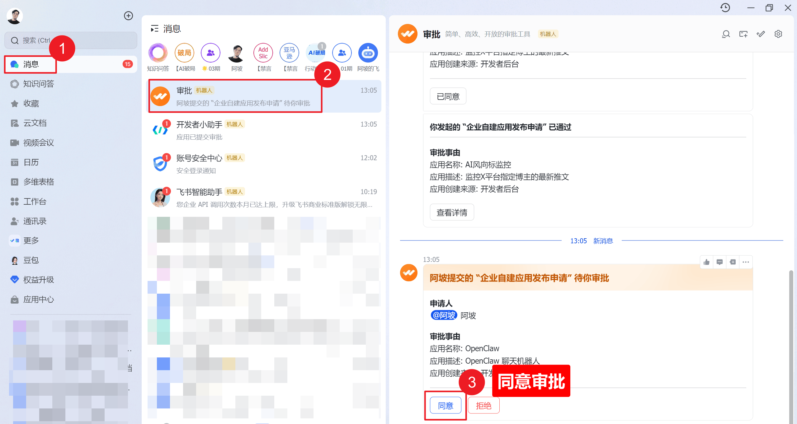 可以看到添加事件按钮由原来的灰色不可点击变为可点击: 添加接收消息事件: 给应用开通获取通讯录基本信息的权限: 重新发布版本: 跟前面的步骤一样,发布为在线应用即可。 现在可以在 飞书中与 AI 助手对话了! 八)在飞书中与OpenClaw对话来到飞书客户端或者手机飞书app上:
