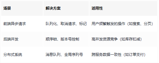 • 用户快速触发多个请求(如连续点击按钮),后发起的请求可能先返回。
