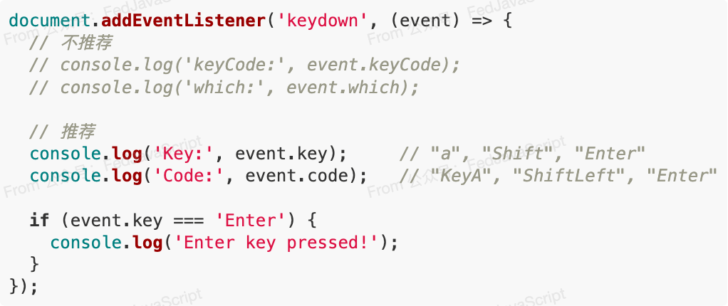 Event.key: 返回一个表示按键物理值的字符串(例如 "a", "Enter", "ArrowUp")。这是最推荐的方式,因为它更直观且具有更好的国际化支持。Event.code: 返回一个表示物理按键代码的字符串(例如 "KeyA", "Enter", "ArrowUp"),不受键盘布局影响。