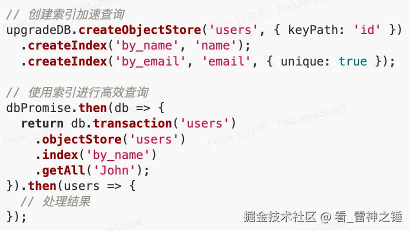 4. 强大的查询与索引能力与 localStorage 的简单键值对不同,IndexedDB 提供了类似数据库的高级特性: