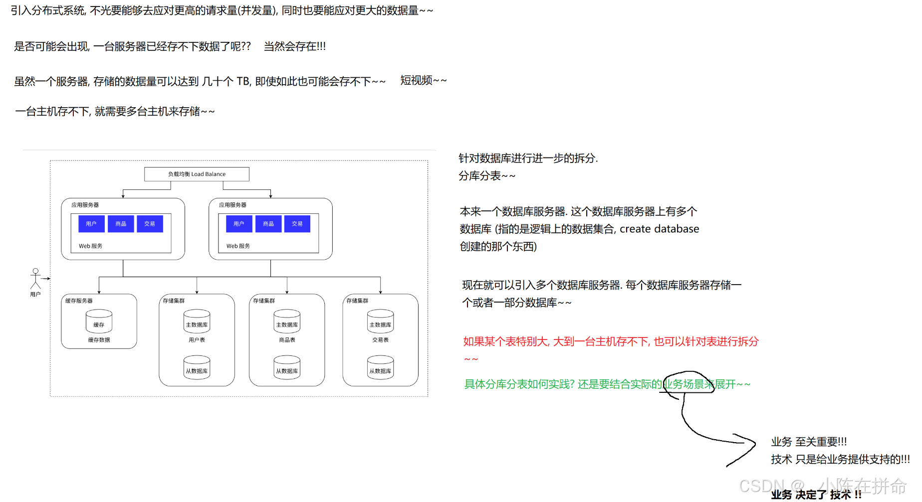 但是如果我们修改了主数据库的内容,势必也有可能需要修改redis的内容,这就可能存在一方修改成功了一方修改失败的这种情况,这就是我们引入分布式需要付出维护数据同步和一致性的代价!! ------>欲戴皇冠,必承其重!!(想得到一个效果就需要付出一定的代价) 相关软件:Memcached、Redis等缓存软件 2.8 数据库分库分表随着业务的数据量增大,大量的数据存储在同⼀个库中已经显得有些力不从心了,所以可以按照业务,将数据分别存储。比如针对评论数据,可按照商品ID进行hash,路由到对应的表中存储;针对⽀付记录,可按照⼩时创建表,每个小时表继续拆分为小表,使用用户ID或记录编号来路由数据。只要实时操作的表数据量足够小,请求能够⾜够均匀的分发到多台服务器上的⼩表,那数据库就能通过⽔平扩展的⽅式来提⾼性能。其中前⾯提到的Mycat也⽀持在⼤表拆分为小表情况下的访问控制。这种做法显著的增加了数据库运维的难度,对DBA(数据库管理员)的要求较⾼。数据库设计到这种结构时,已经可以称为分布式数据库,但是这只是⼀个逻辑的数据库整体,数据库⾥不同的组成部分是由不同的组件单独来实现的,如分库分表的管理和请求分发,由Mycat实现,SQL的解析由单机的数据库实现,读写分离可能由网关和消息队列来实现,查询结果的汇总可能由数据库接口层来实现等等,这种架构其实是MPP (大规模并行处理)架构的⼀类实现。