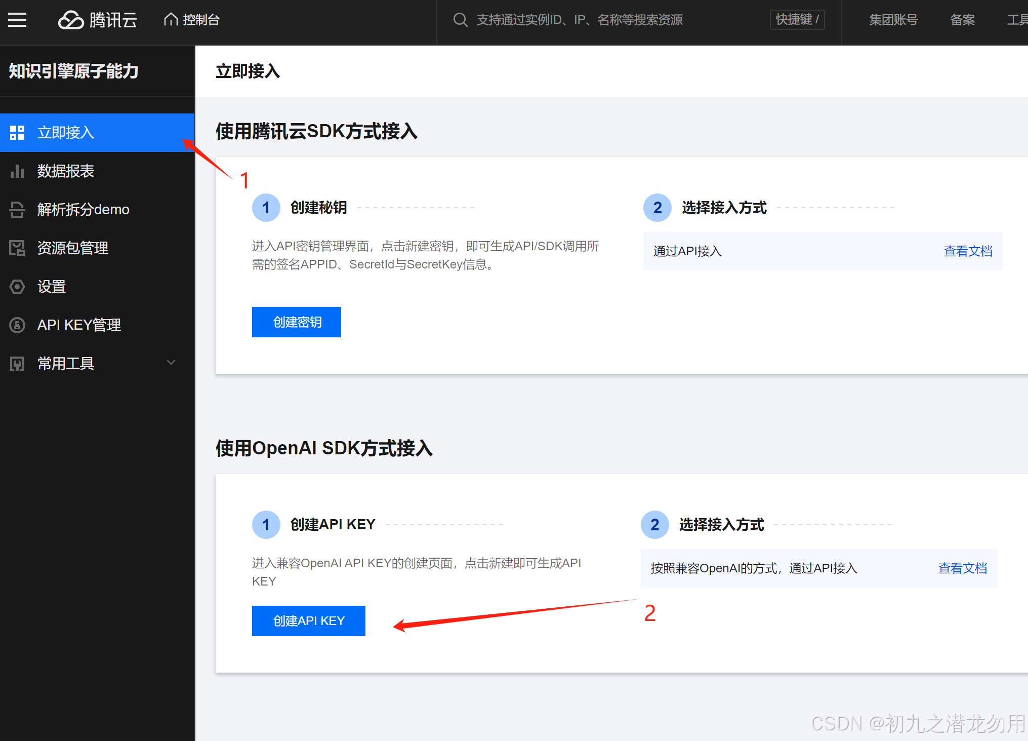 如图选择左侧“立即接入”菜单功能,选择 使用 OpenAI SDK方式接入,点击“创建 API KEY”按钮,按提示操作即可创建,创建成功如下图: