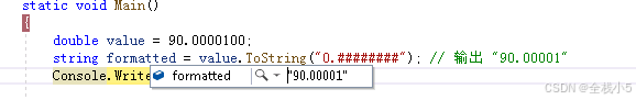 ToString("0.########") | 自定义小数位数 | 90.0000100 → "90.00001" |