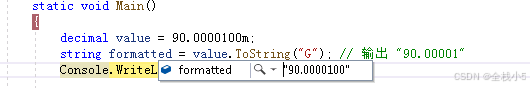 ToString("G") | 自动去除无效零 | 90.0000100 → "90.00001" |