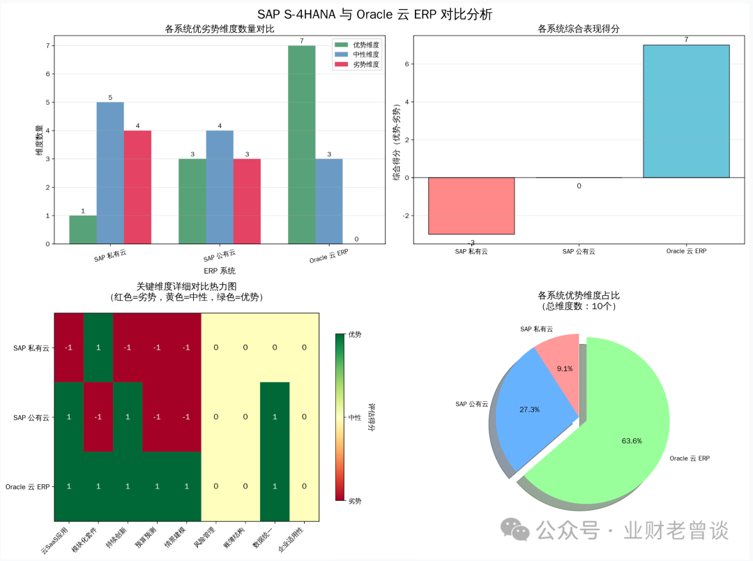 Oracle云 ERP 在整体表现上显著优于 SAP S/4HANA,尤其在云架构、创新能力和业务灵活性方面优势明显,如下图: