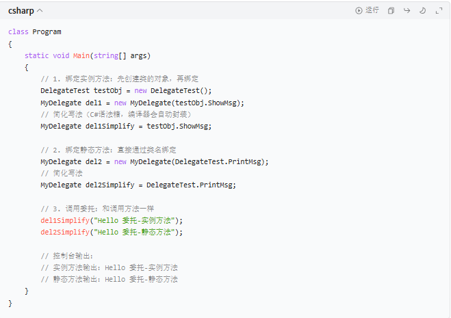C#中使用委托分定义委托、绑定方法、调用委托三步,我们用最简单的代码演示,全程可直接复制到 VS/VS Code 运行。