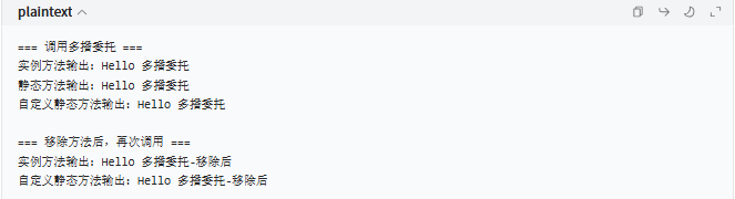 这是委托最强大的特性 ——一个委托对象可以绑定多个方法,形成委托链,调用委托时会按绑定顺序依次执行所有方法。