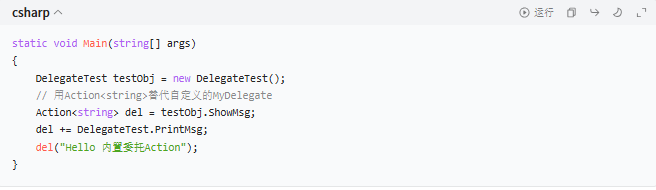 ⚠️多播委托注意点:如果委托有返回值,调用多播委托时,只会返回最后一个方法的返回值,前面方法的返回值会被丢弃;因此建议多播委托尽量使用 void 无返回值,避免返回值丢失问题。1.5 C#内置委托:不用重复定义,开箱即用