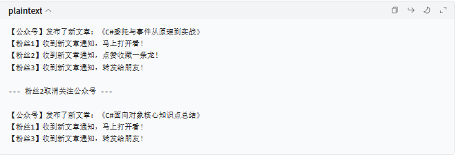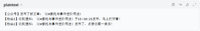 实际开发中,事件触发时往往需要传递一些信息(比如公众号发布的文章标题、按钮点击的坐标),这时候只需要将事件基于带参数的 Action/Func定义即可,修改上面的示例,让事件传递文章标题和发布时间: