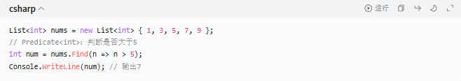 3.Predicate:特殊的泛型委托,固定返回 bool,只有一个参数,用于判断条件(比如集合的 Find、Where 方法),等价于Func。
