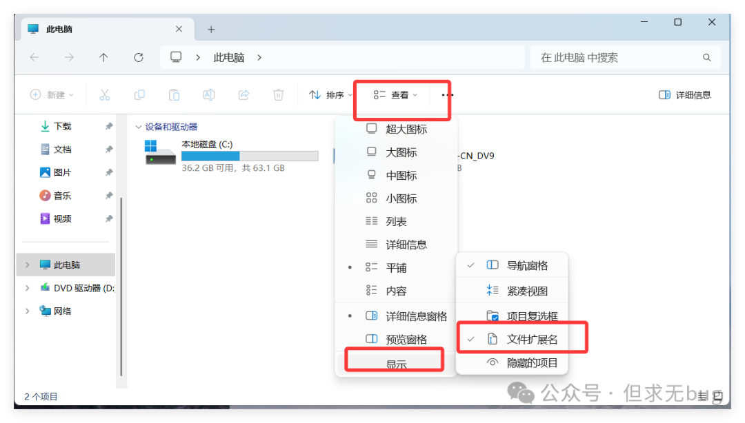 第二步就是依次点击【查看】 > 【显示】 ,找到 "文件扩展名设置信息":