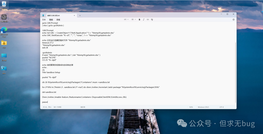 至于这段代码是何含义,本人也不清楚,只知道通过该命令能安装并启用Windows沙盒。粘完毕后需按“Ctrl + S”  或 点击“文件” > "保存"进行保存。