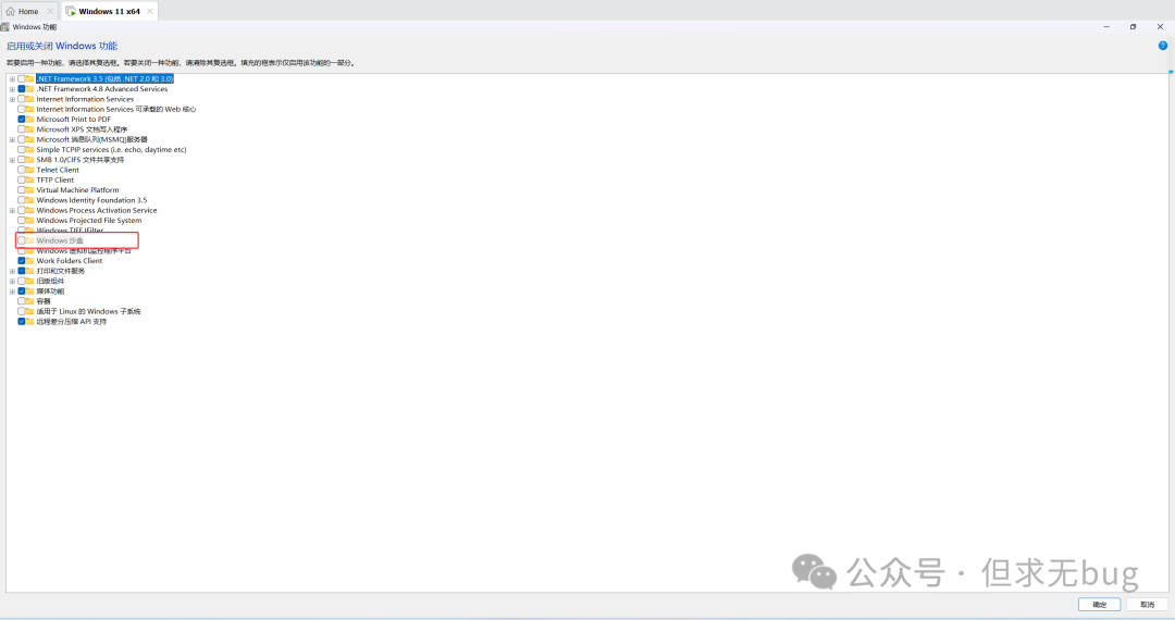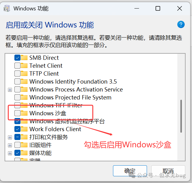 若 Windows版本为专业版及以上版本,则可直接打开 “启用或关闭 windows 功能”选择“Windows沙盒”进行勾选启用即可: