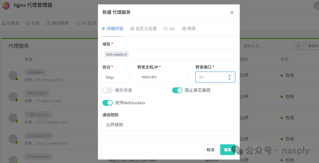 ![]() 一、为什么要用泛域名 + Nginx Proxy Manager?一个隧道管所有:只需绑定一次 *.example.com ,后续子域名全由 Nginx 图形化添加; 零端口暴露:容器只用 expose(暴露) ,外部无需开放任何端口; SSL已自带:Cloudflare 泛域名(wildcard)隧道已HTTPS,内部无需再申请证书; 图形化子域名:鼠标点几下即可添加 alist.example.com 、 emby.example.com …; 功能插件:速率限制、Header注入、缓存Bypass,全GUI操作。 应用场景家庭NAS:不想开放任何公网端口,却要让 alist.example.com 、 emby.example.com 通过域名直接访问; 小型API网关:需要按子域名(subdomain)加鉴权Header或速率限制; 缓存优化:想让静态文件走CF缓存,动态接口Bypass缓存; 美观需求:502/404页面要换成自己品牌页。 一句话:一个泛域名(wildcard)隧道 + Nginx Proxy Manager,零代价换来图形化无限子域名(subdomain)。 二、一键模板注入 token(一次写入) 然后就可以启动docker compose 构建项目了。 Cloudflare 控制台 → Tunnels → Create Tunnel → 复制 token 只需要复制token后面的字符就行。 隧道路由设置 → 添加 泛域名(wildcard) 类型:CNAME 名称: * 目标:隧道ID(自动生成) 保存后,整个 *.example.com 指向隧道,无需再添加其他子域名(subdomain) 其中服务填你后面部署的NAS地址+Nginx Proxy Manager-端口,例如"172.168.1.2:1000",这样你的所有泛域名通通指向ngnix,后续统一由它来完成代理转发docker容器。 1. 浏览器访问 Nginx Proxy Manager http://localhost:81 默认账号: admin@example.com 默认密码: changeme 2. 添加反向代理 域名:填写子域名(subdomain)如 alist.example.com ; 转发主机:填写容器名(container name)如 alist ; 转发端口:填写容器内部端口(internal port)如 5244 ; 点击「保存」。 3. 完成,浏览器访问 https://alist.example.com (子域名/subdomain),已自带SSL,无需再申请证书。 Header注入:增加应用登入用户跟密码,所有的docker都能应用,及其安全方便了。 Bypass缓存:Advanced → Cache → Bypass Cache 错误页美化:Settings → Custom Error Pages → 上传HTML,任意风格,前端看不到任何入口信息,安全。 “一个泛域名(wildcard)落隧道,NPM点子域名(subdomain),expose(暴露)省端口,SSL已自带。” 阅读原文:原文链接 该文章在 2026/2/22 23:21:10 编辑过 |