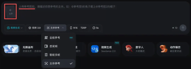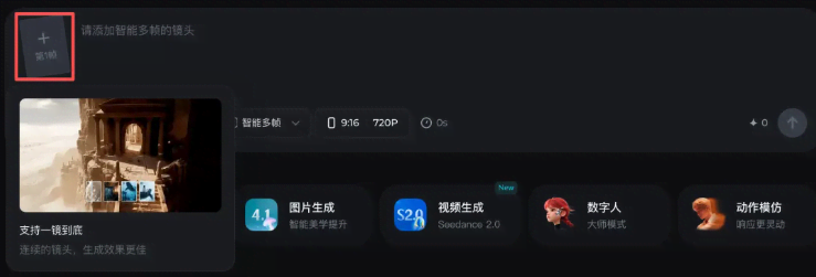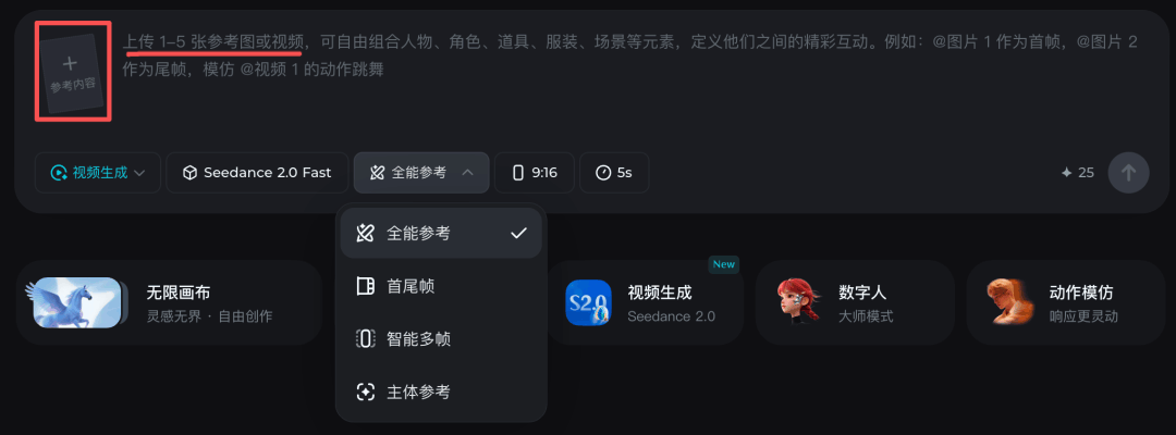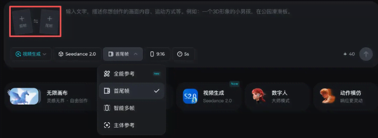 • 选择【Seedance2.0】模型或【Seedance2.0 fast】都行