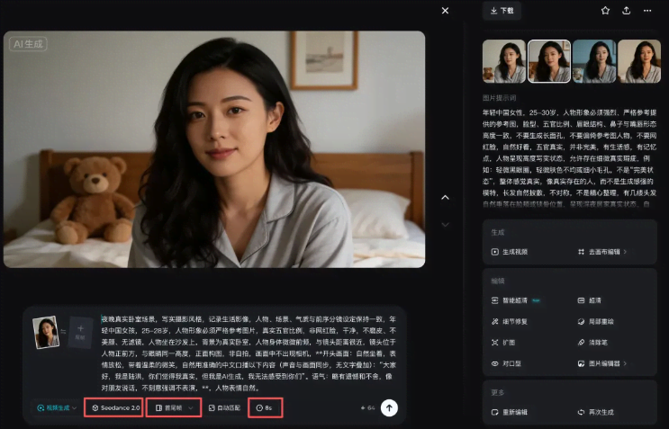 • 生成时间【8s】,由于提示词里说话的字数8秒左右,所以我选择了8秒。