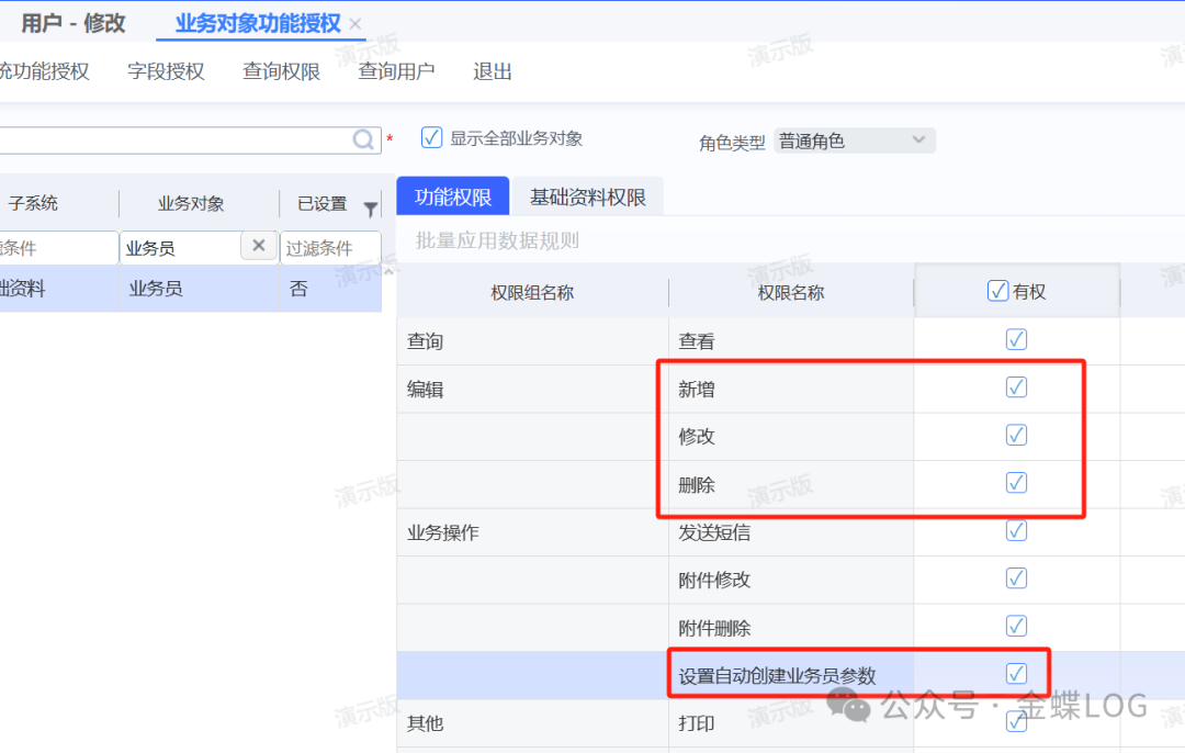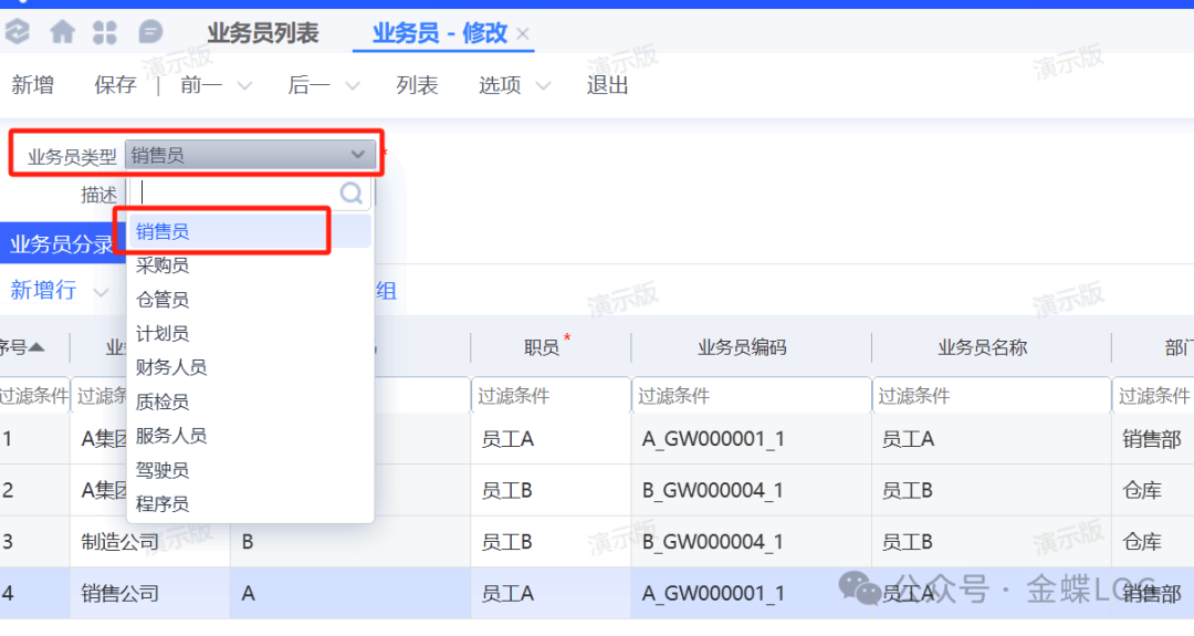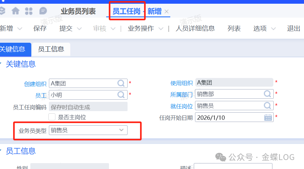 如果说【员工】信息已经创建好,后面才来给这名员工补录业务员,你也可以在新增【员工任岗】的时候,找到业务员类型字段,选择一下业务员。只要操作用户有设置自动新增的权限,审核之后也会自动增加。