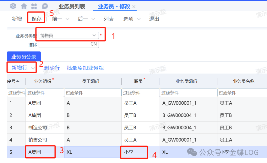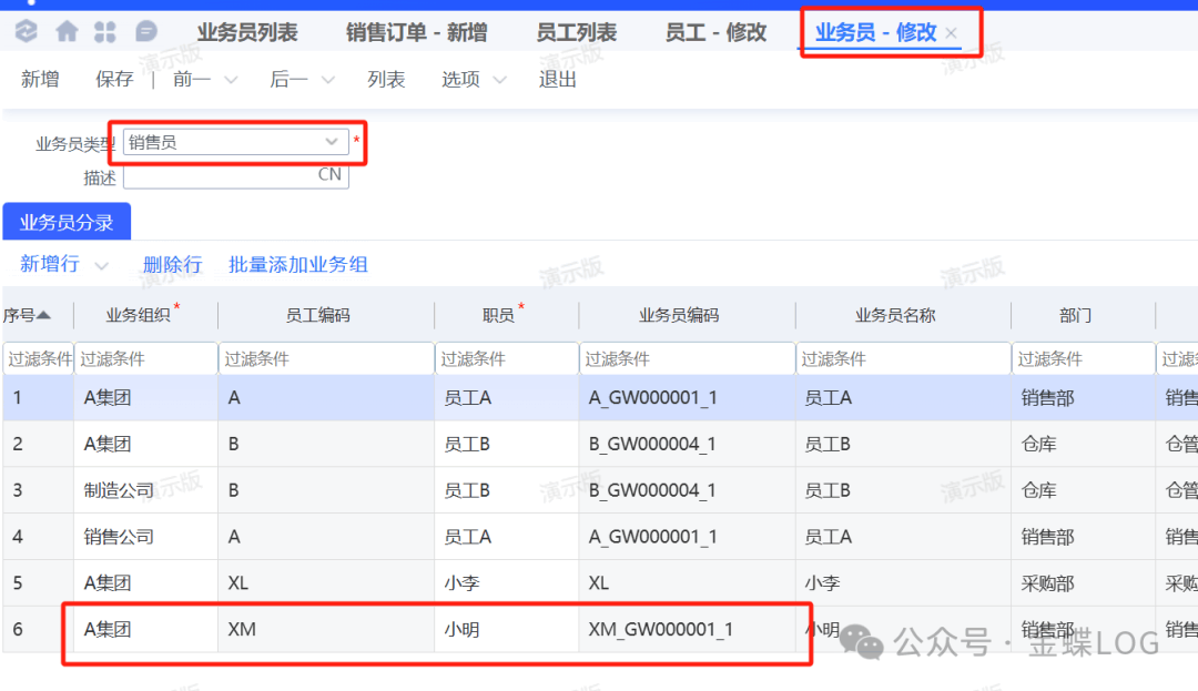 步骤三:将员工信息进行保存、提交、审核再次打开【业务员】信息时,就会看到刚刚新增的员工小明。