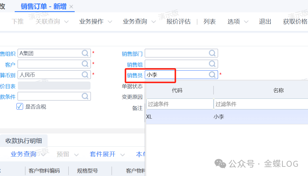 保存之后就可以在销售订单上选到小李这名销售员了。