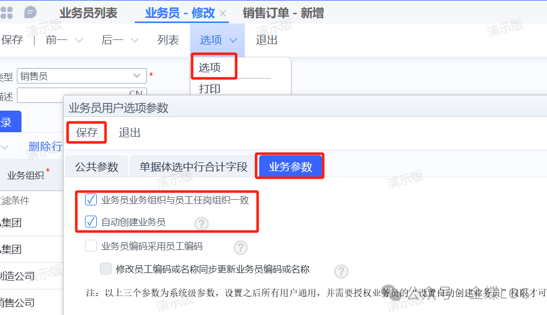 步骤一:先设置自动新增的参数;打开【业务员】修改界面,点击【选项】-【业务参数】,将下面两个复选框给勾上进行保存
