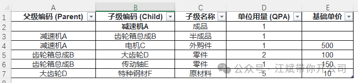 在制造业的经营分析中,BOM(物料清单)就是一切数据的“灵魂”,在大部分制造业(尤其是离散类制造业),材料成本占了70%-80%的比例,可以说是事关产品是否盈利的核心中的核心,而且材料的市场价格波动最剧烈(铜、铝、钢天天涨跌),所以老板每天盯着的,最关心的就是材料费无疑了,这是中小制造业企业的量本利动态测算的核心痛点。 很多制造企业的财务同仁在做成本分析和报价模拟时,最痛苦的莫过于:ERP导出的或者公司的BOM表单是“断层”的,特别是对于那种BOM层级很深的制造行业。 比如你想看某个成品由于底层某种“特种钢材”涨价带来的成本波动,结果发现中间隔着齿轮、齿轮箱、传动组件等五六层半成品,5、6层还算少的,多的甚至到了几十层,每一层都有不同的用量和损耗。传统的Excel函数处理如VLOOKUP只能处理一级,遇到多级嵌套的“套娃”,除了手工拉表、按计算器,似乎别无他法。而一旦工程研发部门改了bom配方,所有表格模板可能瞬间作废,财务只能连夜加班调整。 今天就带大家跳出传统的“表哥表姐”思维,从数据建模的角度,利用 Excel(PowerBI的也行)自带的 Power Pivot(数据模型)这个神器,给大家拆解演示如何搭建一个全自动的多级BOM成本穿透模拟计算工具,内容非常干。 在动手做这个工具之前,我们要先搞懂业务逻辑。我们以合肥某中小型机械制造代工厂的一个场景进行说明,假设老板问你:“如果特种钢材每公斤涨了2块钱,我们的主打产品‘减速机A’总成本会涨多少?” 要回答这个问题,得先知道减速机A的BOM构成,并且如果你不把这个减速机A的多层级BOM“展平、穿透”,你也根本回答不了这个问题。因为系统里可能只显示减速机的成本,而钢材的成本隐藏在半成品的肚子里。 我们要做的,就是造一台“X光机”,把隐藏在深处的原材料活生生地“拽”到最顶层,直接和最终成品挂钩。一旦底层单价发生变动,顶层成品的成本瞬间联动刷新。这,才叫真正的“报价联动与利润预测”,这才是能辅助老板决策的财务BP的核心价值所在。 为了让大家看透本质,下面模拟了一个制造业最典型的精简版BOM。 假设你的ERP里导出了这样一张原始基础表(共5层数据):