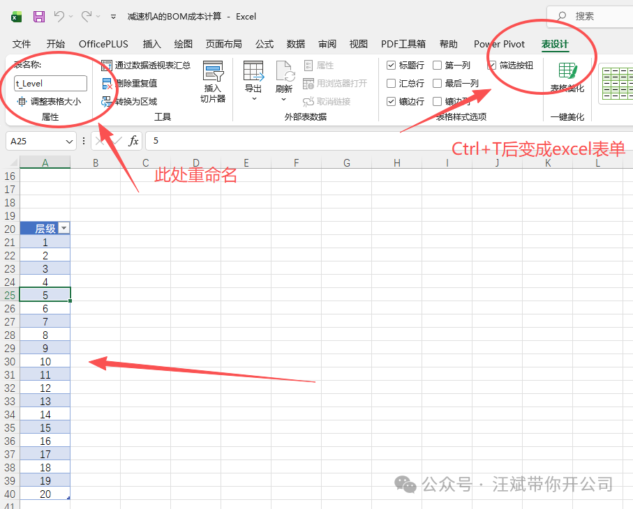 ②建立降维辅助表:为了兼容Excel的DAX引擎,我们需要手动建一张层级表。在旁边空白处输入数字 1 到 10(假设你的BOM最深10层),表头命名为 层级。同样按 Ctrl + T,命名为 t_Level。