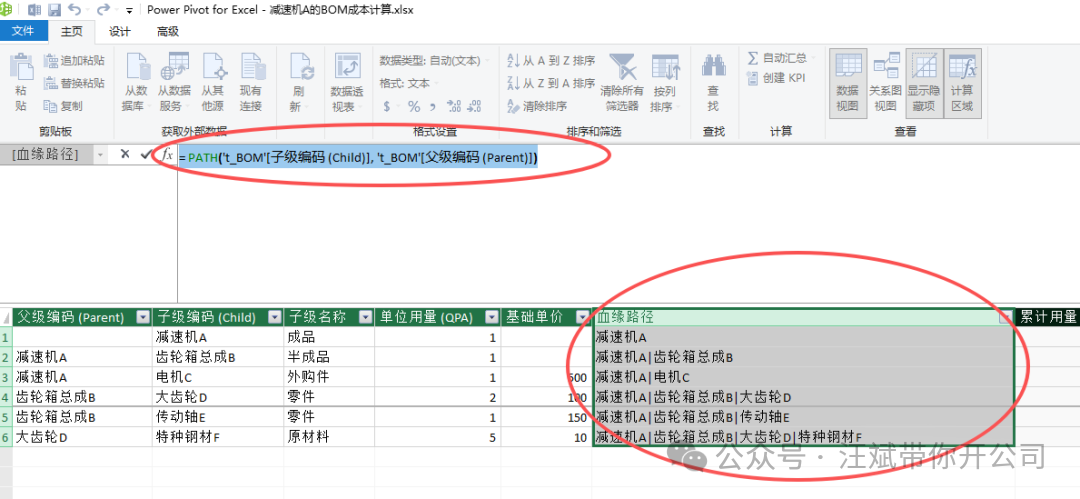 在 Power Pivot 界面中,我们要在 t_BOM 表后新增计算列。我们要让电脑知道,钢材F到底是谁家的孩子。 新建列公式(命名为“血缘路径”):