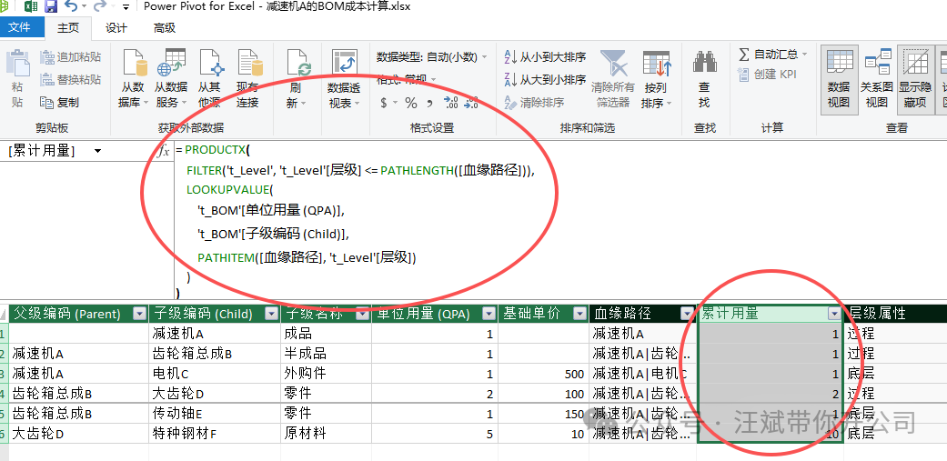 小编解读:PATH 是树状结构的核心函数。执行后,特种钢材F 那一行会生成 减速机A|齿轮箱总成B|大齿轮D|特种钢材F 的完整族谱。电脑瞬间摸清了上下级关系。 这是整个模型最核心、最硬核的算力体现。我们需要让电脑顺着刚才的“族谱”,把一路上的用量全部乘起来。 新建列公式(命名为“累计用量”):